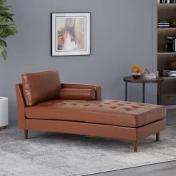Hixon Contemporary Tufted Upholstered Chaise Lounge, Cognac + Espresso