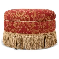 Yolanda Tufted Round Ottoman With Bullion Trim, Red Gold Jacquard