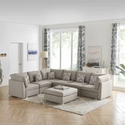 Amira Beige Linen Fabric Sectional Sofa With Ottoman And Pillows