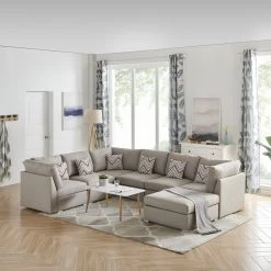 Amira Beige Linen Fabric Sectional Sofa With Ottoman And Pillows
