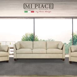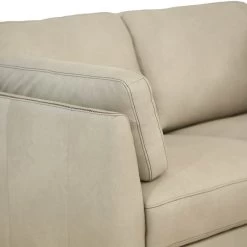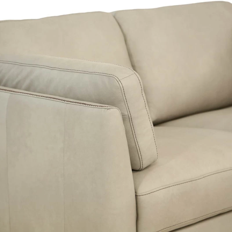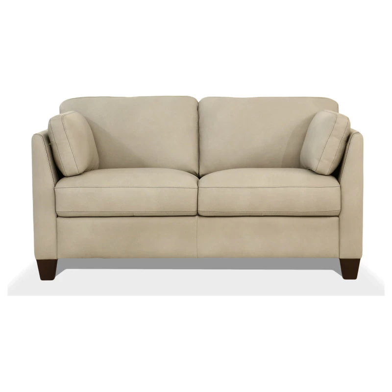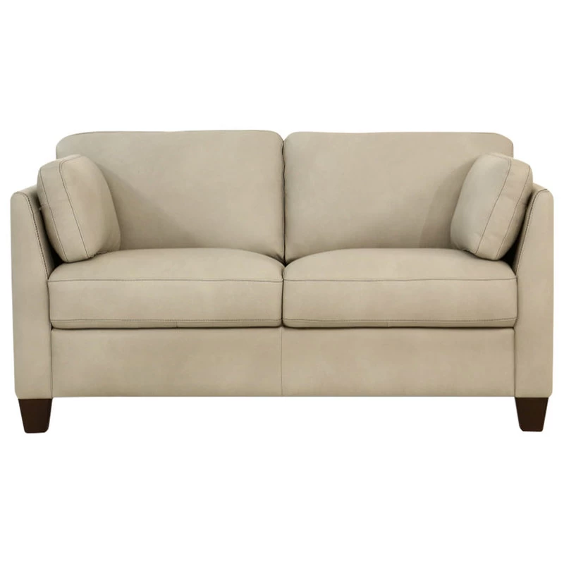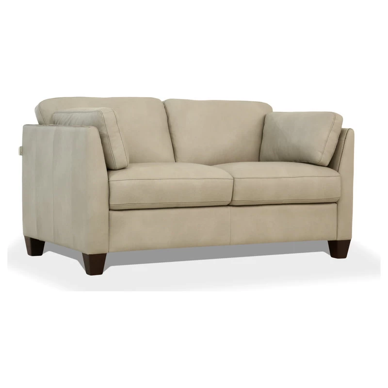 The Matias loveseat is one you’ll want to spend lots of time in. This beautiful dusty white leather loveseat features contrast tone stitching and unique wooden block legs. Its deep, comfy seat and sloped style padded arms with pillow give it an incredible sink-right-in quality that’s perfect for the whole family.