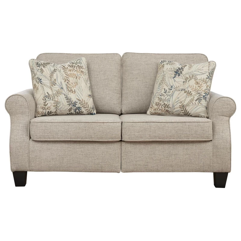 Whether your home is adorned with contemporary or American classic furnishings, the Allesio loveseat has a timeless sense of elegance that’s sure to fit right in. Signature elements include roll arms and cutaway side profiling for added flair. Ultra neutral and plush to the touch, the sesame-hued fabric is a brilliant reflection of your good taste. Rounded cornering gives the box cushions a softened, tailored aesthetic.