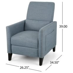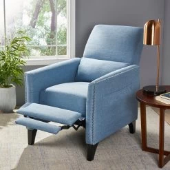 Sit back and enjoy a relaxing evening in our sleek push-back recliner, perfect for unwinding after a long day. This convenient contemporary recliner chair provides an incredibly high degree of coziness in an attractive package. Featuring plush seating and an intricate nailhead trim, this recliner pairs perfectly with the push-back functionality allowing for high comfort with little effort. Sure to become the new favorite spot of leisure, you and your family will surely enjoy this recliner for years to come.