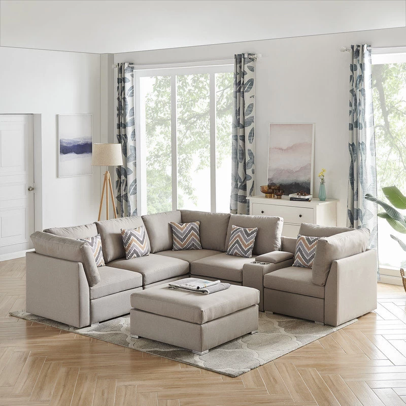 Comfort, Style, and Quality! These are the important features for the Amira Collection. This beautiful modular sofa sectional couch with USB console with cupholders, ottoman, and five matching accent pillows will fit into any living room and impress your guests! The comfortable beige linen fabric with matching accent pillows will light up your living room with the most trendiest of looks. Perfect for apartments, condo, loft, and single family home, you will be able to welcome multiple guests comfortably where everyone is able to enjoy entertainment together.