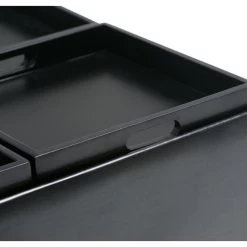- Features large interior storage space with four flip over serving trays
