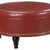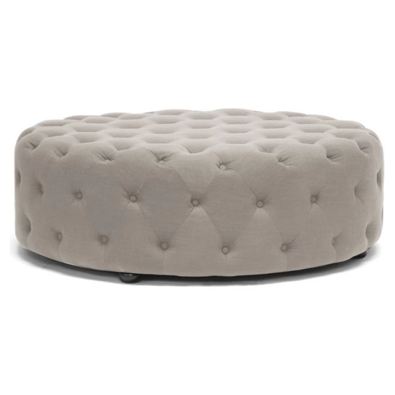 Tie your room together with the well-designed Cardiff Modern Ottoman. This large, circular footstool softens a space with its lack of angles and its versatile, neutral beige linen upholstery. A surplus of button tufting brings an element of traditional style to this otherwise contemporary ottoman. Our Cardiff Ottoman is fully assembled and made in China with eucalyptus wood, polyurethane foam padding, and black wood legs. A dark gray linen option is also available (sold separately). Spot clean only.