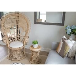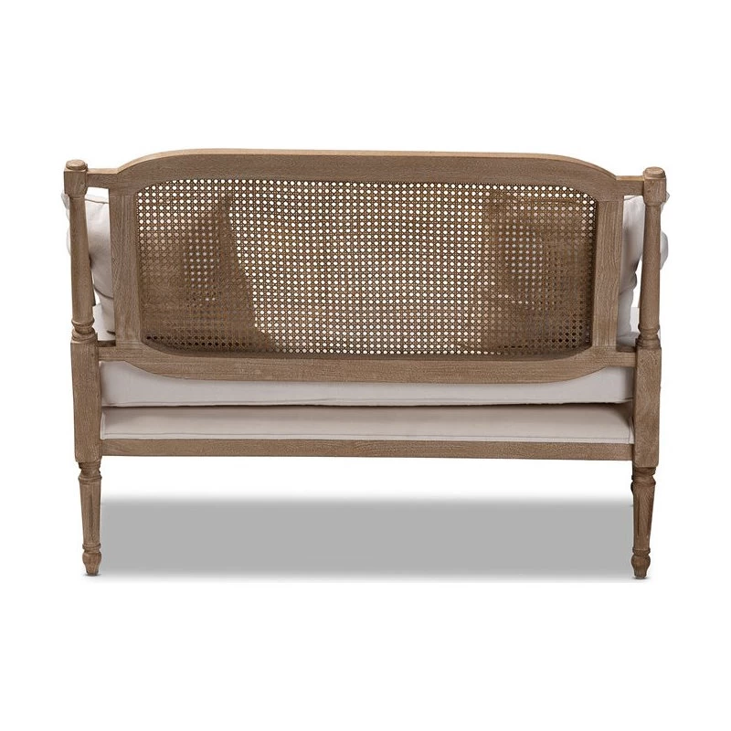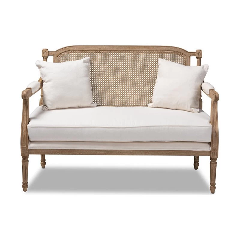 Fit for the home of a French aristocrat, the Clemence loveseat adds elegance to any room. Constructed from solid mahogany wood, the Clemence displays a natural white-washed finish for an antique look. Stunning craftsmanship is shown on the intricately carved frame, as well as the woven rattan back. Designed to add both beauty and comfort to your space, the Clemence is upholstered in an elegant ivory fabric and features thick foam padding on the seat and armrests. Two matching accent pillows complete the look. The Clemence loveseat is made in Indonesia and requires assembly.