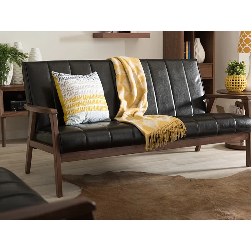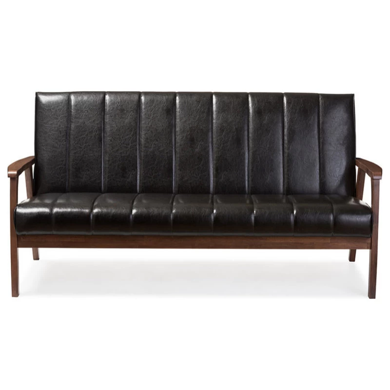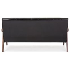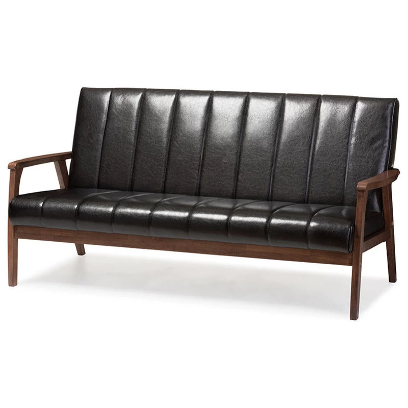 The Nikko is a stunning 2-seater loveseat perfect for modern lounges and receptions. It incorporates the elements of simplicity, style and comfort, wrapping it all into a new and clean silhouette. Made from solid rubberwood, it is purposefully designed for compact everyday use. Upholstered in black faux leather and padded with foam, the Nikko is ideal for the conservatory, kitchen or your living room. Angular wood frame gives a nod to mid-century style, combining Scandinavian design with lux colonial wood in cocoa finishing and complementing the black-toned upholstery for a moody palette steeped in classic masculinity. Made in Malaysia, the Nikko requires assembly.