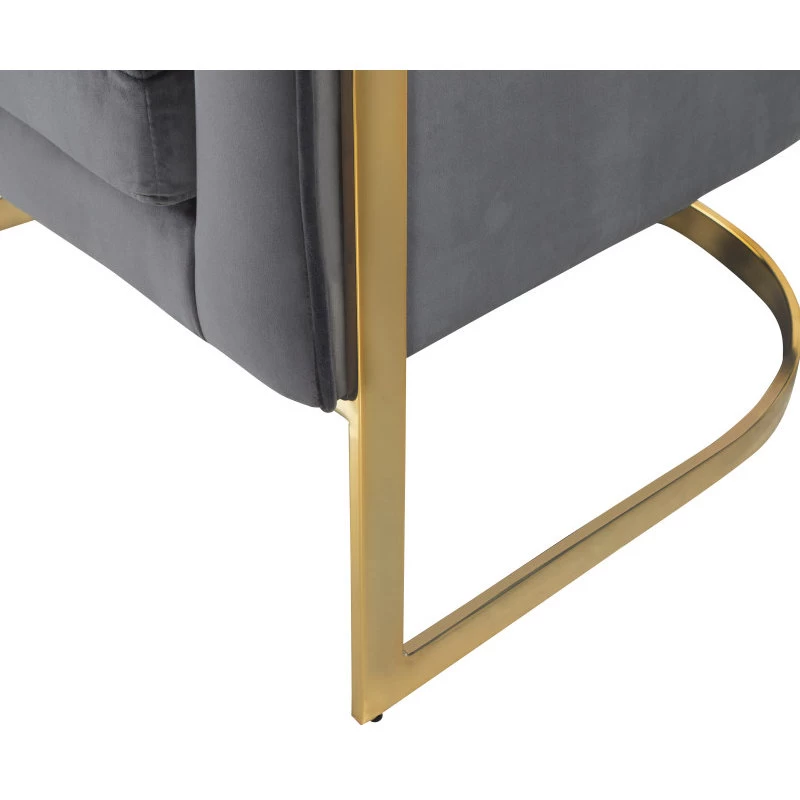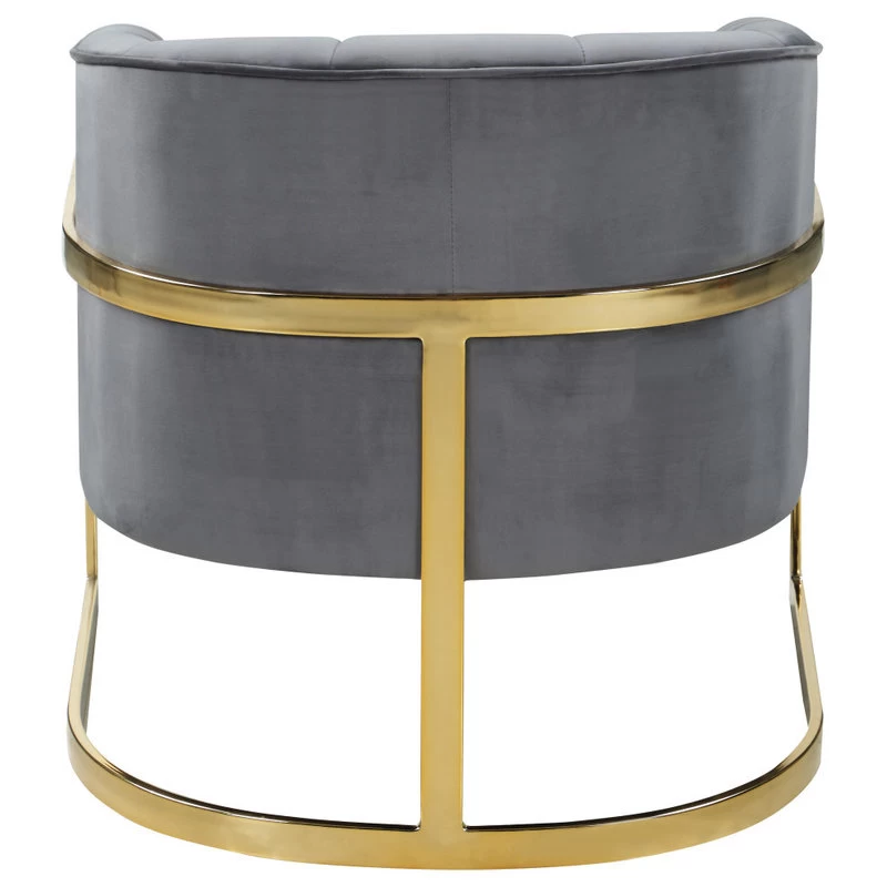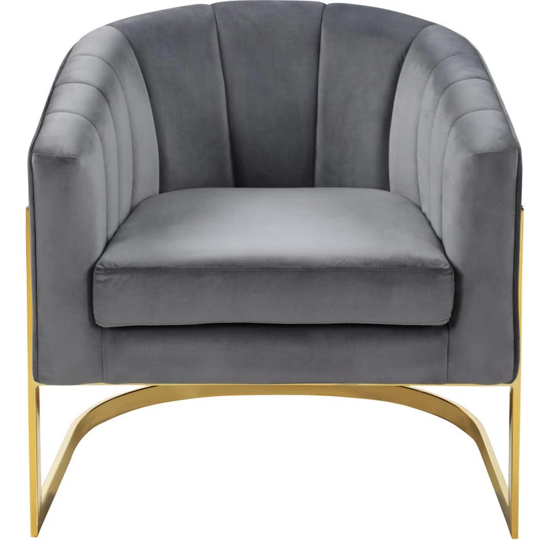 Add a touch of modern drama to your space with this Carter gray velvet accent chair from Meridian Furniture. This chair offers a super plush cushion that cradles your body in exquisite comfort as you sit, making it easily become your favorite spot in the house. Tufted channels on the arms and back add a textured feel to the chair, and it�۪s upholstered in gray velvet, so it�۪s soft and supple against the skin. The stainless steel base is finished in gold, adding to its elegant demeanor for your modern home.