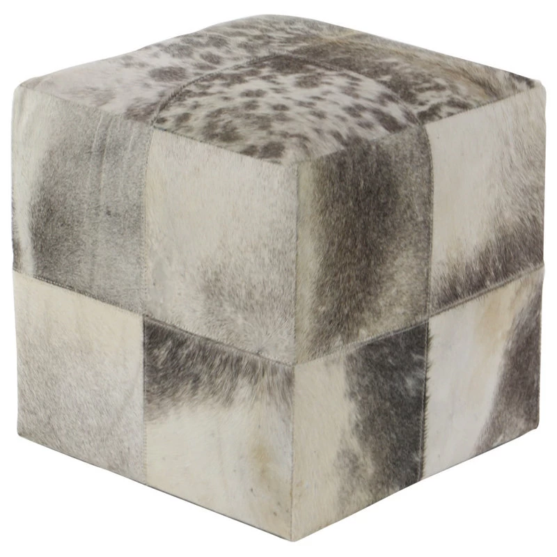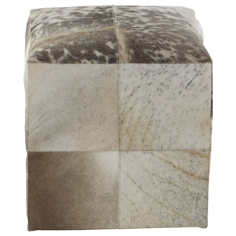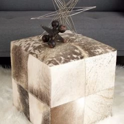 Sit back and relax with your feet rested on this comfortable stool. The perfect combination of form and function with a stylish design. Cube leather accent stool will complement an upholstered velvet sofa with light colored pillows for a luxurious appeal. This item ships in 1 carton. Due to the handmade nature of this item, no two will be alike, there will be slight differences in shape, size, and color. Suitable for indoor use only. Leather and hair on hide are natural products, and therefore no two will be alike. There may slight variations in pattern, natural blemishes, colors, and overall aesthetic of the product. Maximum weight limit is 200 lbs. Made in India. This is a single stool. Contemporary style.