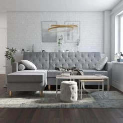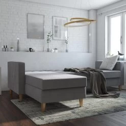 You need this CosmoLiving Liberty Sectional Futon with Storage. It’s simple, stylish and the perfect small space solution with its compact design and functional features. Choose between a fierce green velvet, blush pink velvet, ivory velvet, black velvet or light grey chenille finish with delicately crafted diamond tufting and brass legs for a #flawless Insta-worthy look. The chaise can be configured to set up on either side of the futon and the wide storage compartment is perfect to hold off-season clothing (or that laundry you needed to do, like yesterday). The adjustable back allows you to recline to kick it comfortably or lie flat for the best night sleep you never had…