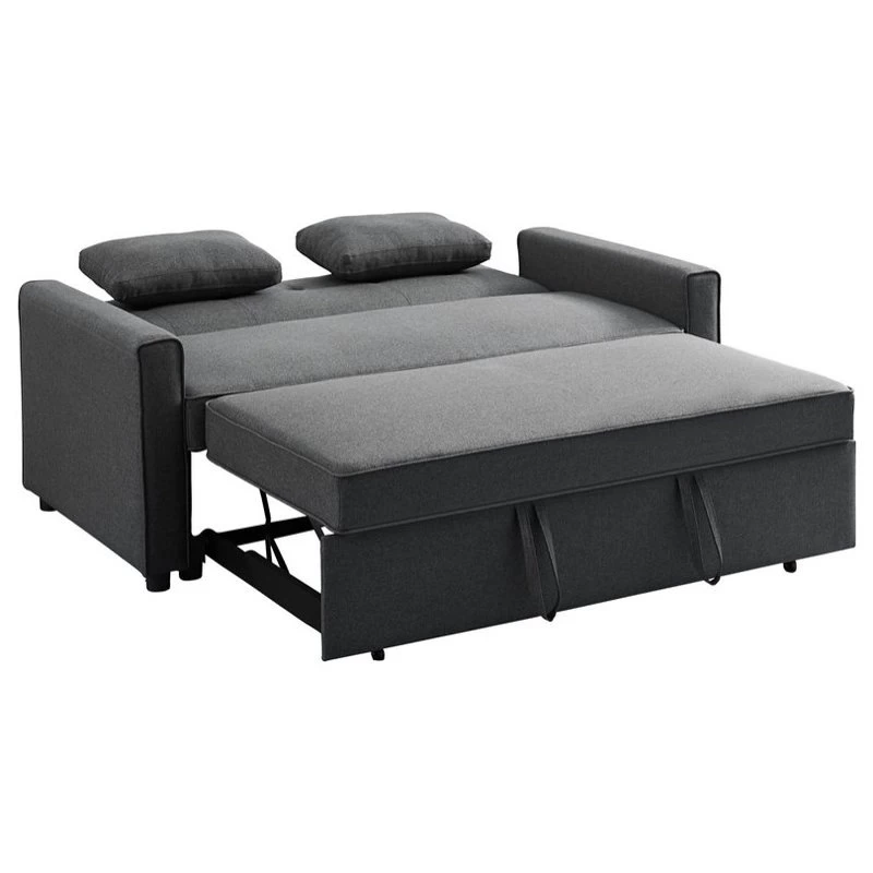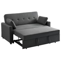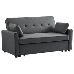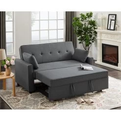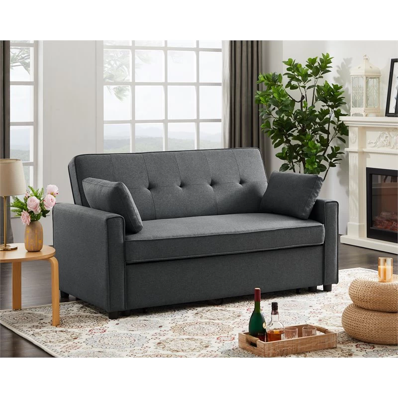 Seating by day, sleeping by night, this versatile fabric gray color loveseat pulls out to create a sofa bed when overnight guests arrive. As a loveseat, it offers a classic mid-century vibe with single back and seat cushions wrapped in sofa and inviting gray fabric upholstery. Tufting adds character to augment any room, from the main living area to a home office or playroom that doubles as guest quarters.