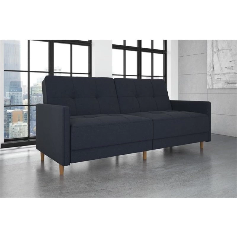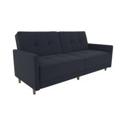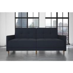 The mid-century modern look is making a comeback in a big way, and we’ve captured it all here for you in our stunning Andora coil futon. The tufted upholstery gives this futon its unique charm, available in your choice black or white faux leather, as well as in Gray or navy blue linen—perfect to fit your home’s décor! Plus the sleek wooden legs add to the sofa’s style, with centre legs designed to provide extra stability. The sofa’s secret is its split-back design that allows guests to adjust their angle of comfort. So you can each sit up, lounge back or open up the space to lie flat. The independently encased coils are designed to offer complete comfort by day and extra support at night when your futon opens up for overnight guests. The Andora is small enough for tight living spaces while providing you with big style and comfort!