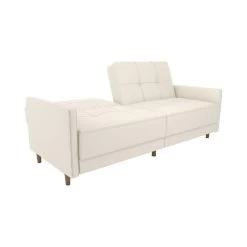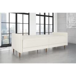 The mid-century modern look is making a comeback in a big way, and we’ve captured it all here for you in our stunning Andora coil futon. The tufted upholstery gives this futon its unique charm, available in your choice black or white faux leather, as well as in Gray or navy blue linen—perfect to fit your home’s décor! Plus the sleek wooden legs add to the sofa’s style, with centre legs designed to provide extra stability. The sofa’s secret is its split-back design that allows guests to adjust their angle of comfort. So you can each sit up, lounge back or open up the space to lie flat. The independently encased coils are designed to offer complete comfort by day and extra support at night when your futon opens up for overnight guests. The Andora is small enough for tight living spaces while providing you with big style and comfort! This DHP Andora Modern Coil Faux Leather Convertible Sleeper Sofa in White will undoubtedly be a great addition to your home décor.