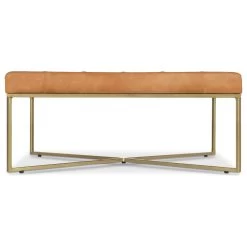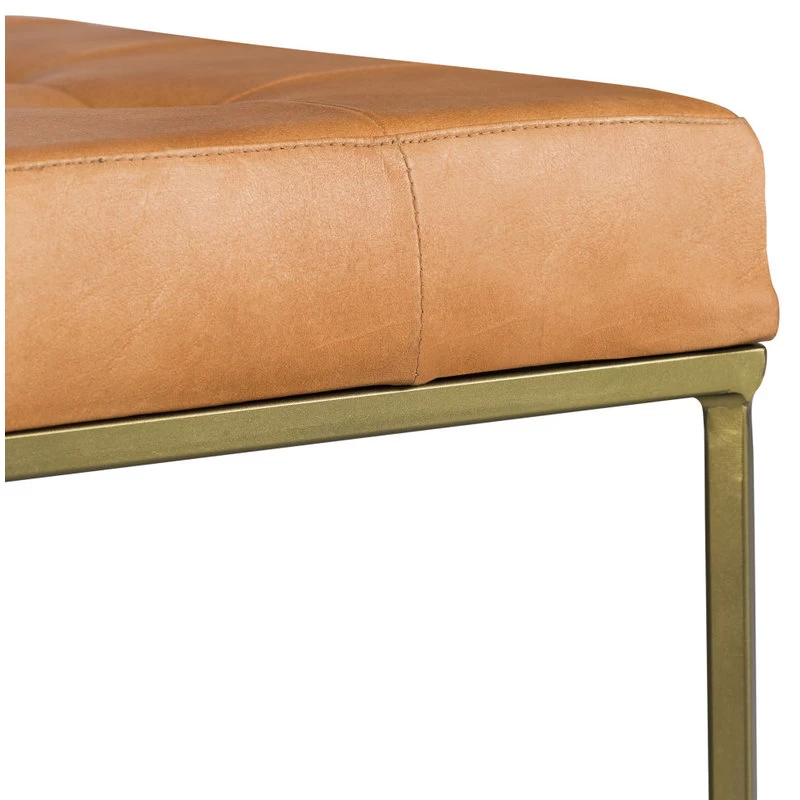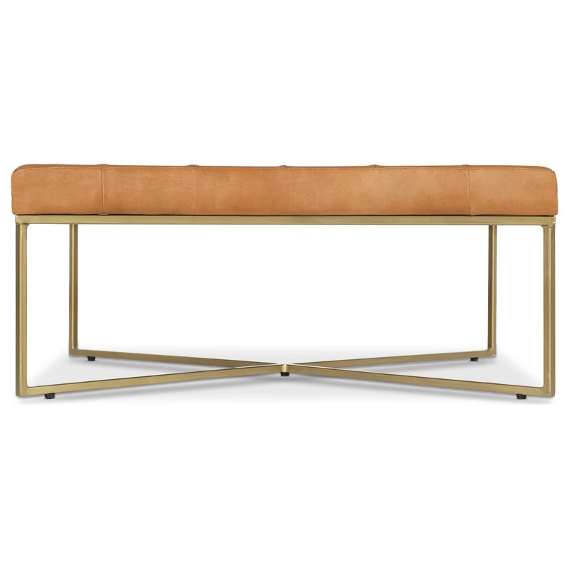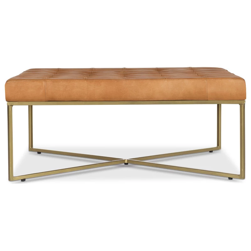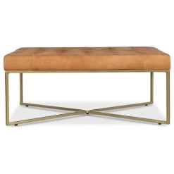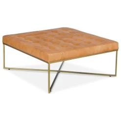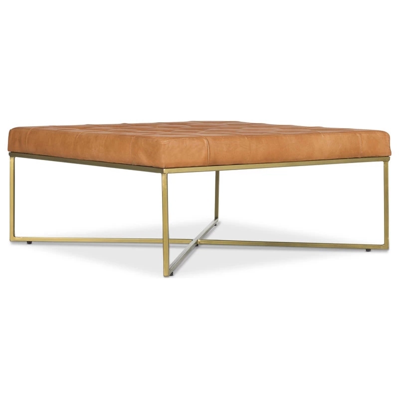 A rustic modern workhorse. We’ve combined hand-finished tufted leather with powder coated legs in an antique brass finish to create a sleek ottoman that does double duty as a coffee table without skipping a beat. Just add a few trays and keep the party going.