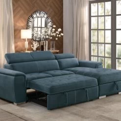 Providing the flexible option for relaxation, sleep and storage, the Elenor Collection will be a stylish and functional addition to your living room. Under seat storage is revealed with the pull of a tab on the end chaise. The lower portion of the seating configuration pulls out to reveal a pop up trundle that creates a bed space creating a relaxing environment with minimal effort. The collection is offered in blue or taupe fabric, both with contrast stitching.