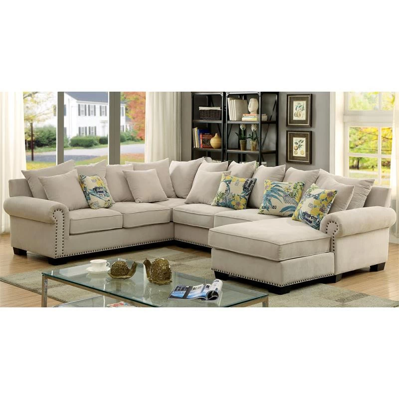 This Beige Fabric Sectional by Furniture of America is framing by gorgeous lustrous nailheads and features beautiful scrolled arms. Foam-filled cushions wrapped entirely in a soft beige fabric upholstery, the pillow back design brings cozy comfort to every part of the sectionals while vibrant patterned accent pillows deliver charming flare. Wooden block feet ensure strength and lasting support as they uphold the spacious solid wood framed sectional. Elevate your living room with the elegant Sectional.