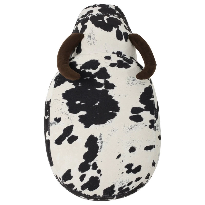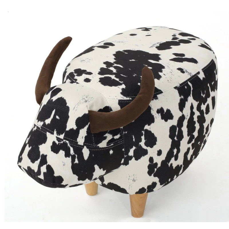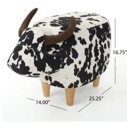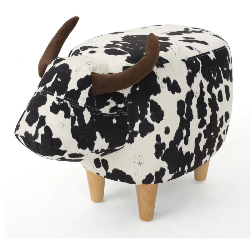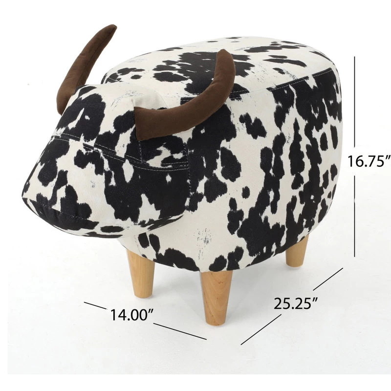 Coordinate a cute and unique design scheme with help from our precious cow ottoman. Designed to look like a faceless, yet still lovable cow, this ottoman is sure to bring out your inner child. The quirky footstool ottoman is ideal for your child’s playroom or any other fun, eclectic room. The spotted surface adds pattern and contrast to your space, horns add even more detail, and tapered legs tie the piece together. Embrace your playful side with our charming and adorable cow ottoman.