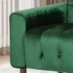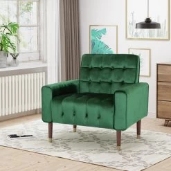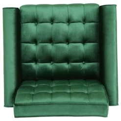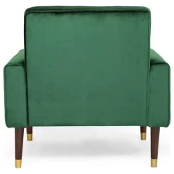 HAND-CRAFTED DETAILS – This accent chair is upholstered and button-tufted in jewel-toned velvet with a waffle stitch. Its seating design is plush and inviting against tapered birch legs in dark espresso with golden tips.