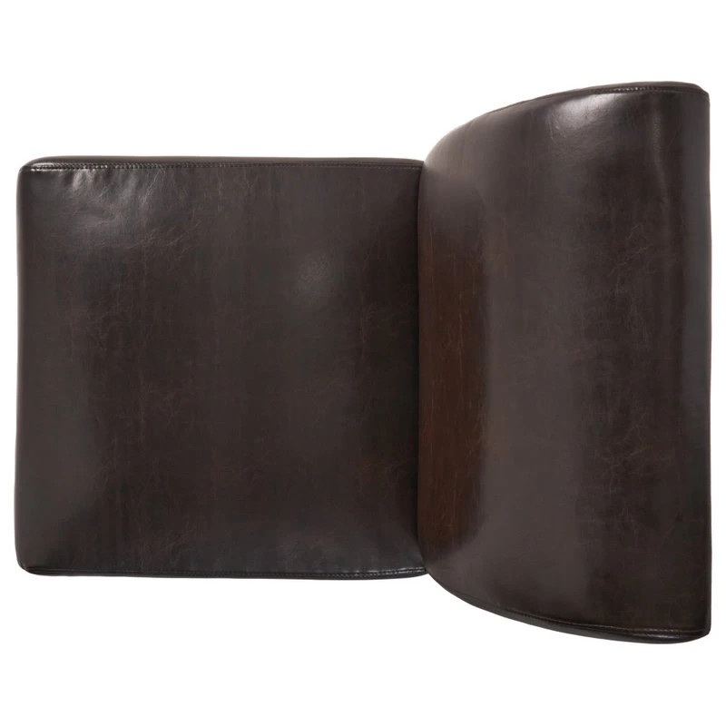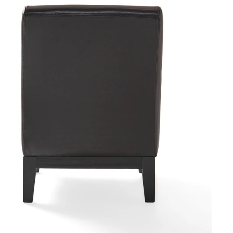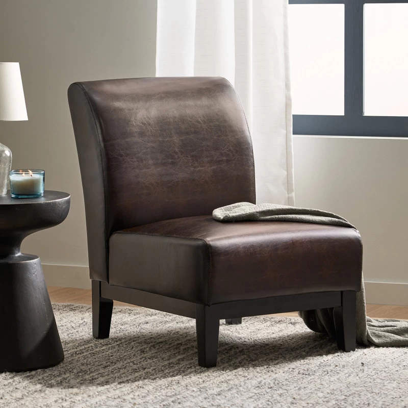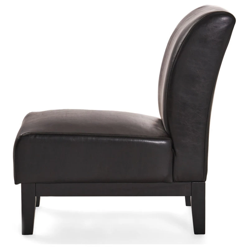 The Braker Brown Slipper Chair is upholstered in smooth brown bonded leather and stands on brown wooden legs. Its size, simplicity and stylish design make this piece perfect for any small space.