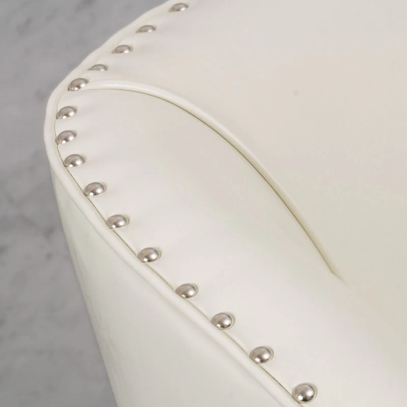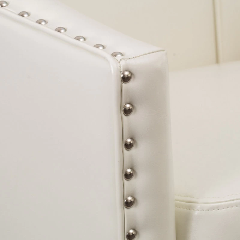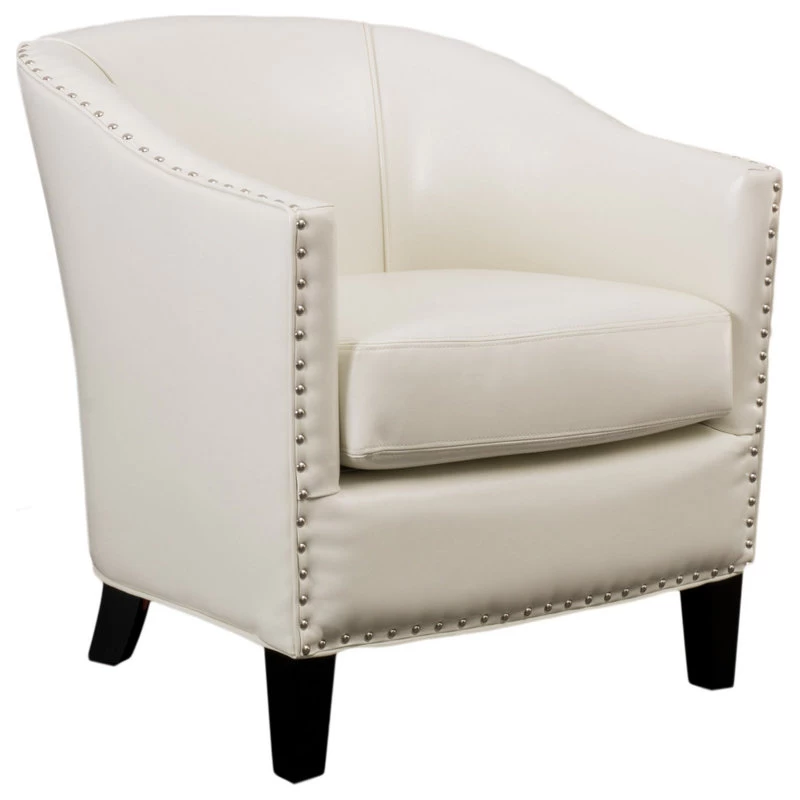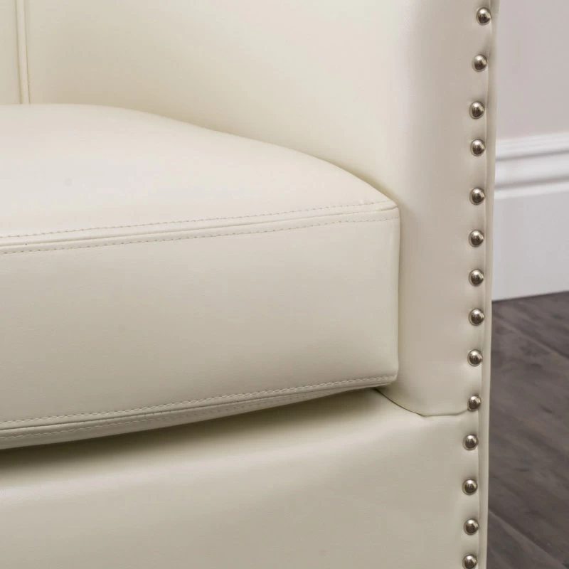 The Carlton Club Chair is a fusion of modern style with the luxury of fabric or bonded leather. Crafted with only the highest quality materials, our soft bonded leather or plush soft fabric with studded accents, this club chair provides extra comfort and an entirely new level of sophistication.It catches your eye with its curved arms and back, along with the chrome studs along the front, bottom, and sides. The chair’s composition is completed with tapered legs in espresso finish.