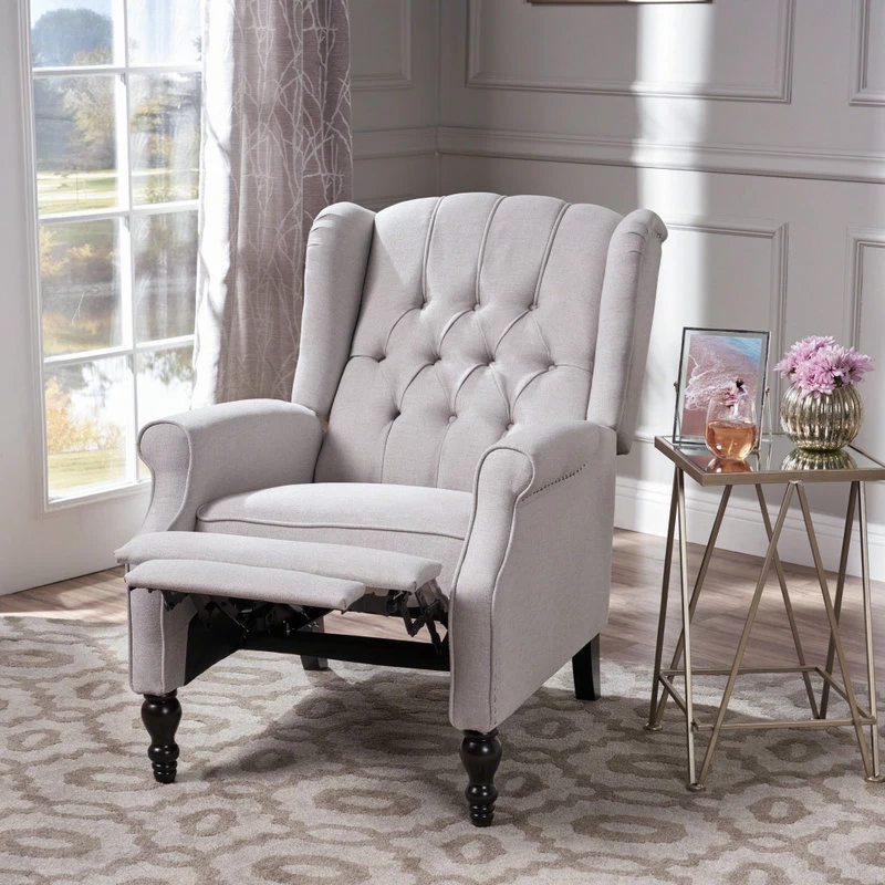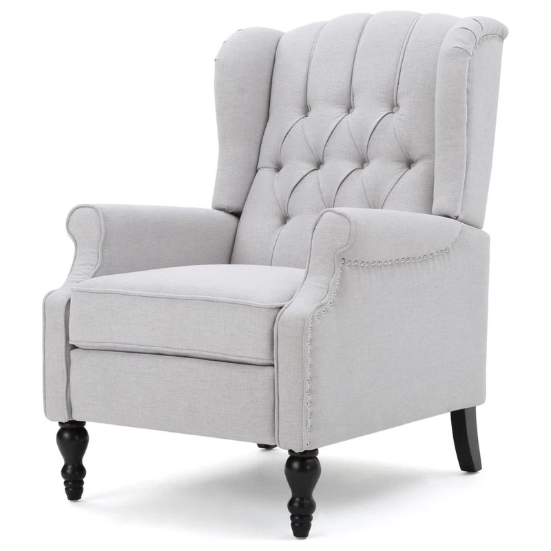 Perfect for entertaining or relaxing, our armchair uses a smooth pushback reclining mechanism and carefully crafted accents to tie your home together with absolute sophistication. This pushback recliner features gorgeous details such as button tufting, diamond stitching, and tonal piping to bring your decor to the next level. Finished with a lovely wingback design and rolled recessed arms, our recliner is as stylish as it is functional.