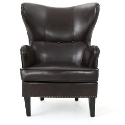 The Romford Wingback Leather Club Chair is a great piece for any room in your home. This armchair is a contemporary piece that features a high wingback backrest and padded cushion. Nailhead line the perimeter of the chair for an innovative and classic look, making it the perfect accent piece to compliment most modern and contemporary living room, bedroom or office furniture.
