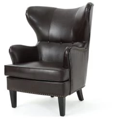 The Romford Wingback Leather Club Chair is a great piece for any room in your home. This armchair is a contemporary piece that features a high wingback backrest and padded cushion. Nailhead line the perimeter of the chair for an innovative and classic look, making it the perfect accent piece to compliment most modern and contemporary living room, bedroom or office furniture.