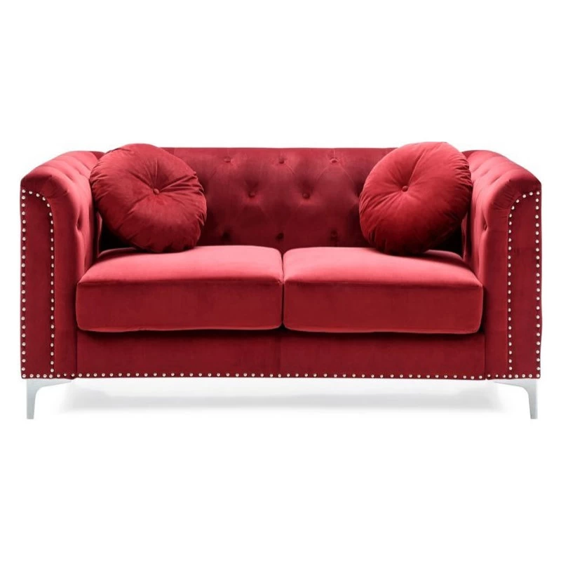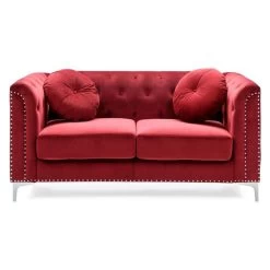 Soft velvet button tufted on the inside of the arms and backs. Pocketed coil cushion seats make this set comfortable and stylish. Nailhead trimmed and finished off with chrome plated legs, it also includes round matching throw pillows. KD design allows for EZ delivery to any home or room! Choose from sofa. Loveseat chair or reversible chaise sectional