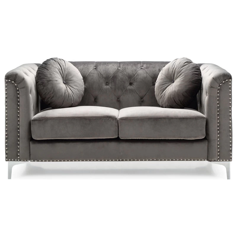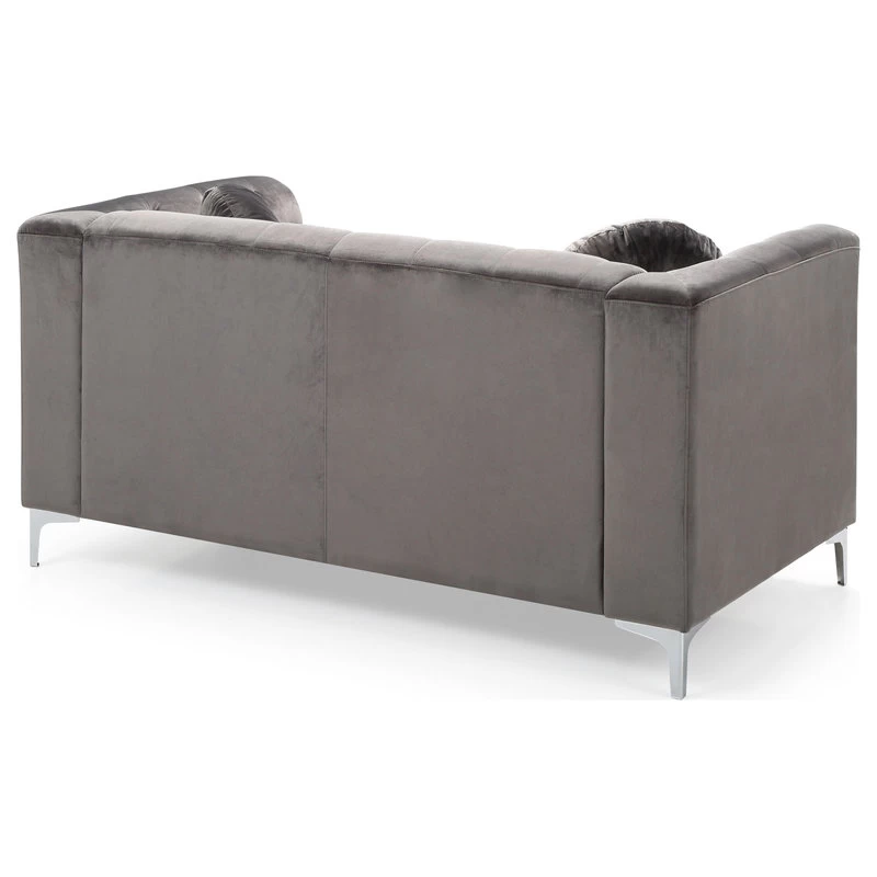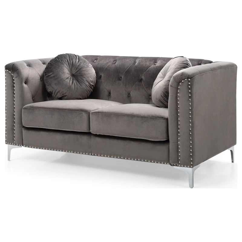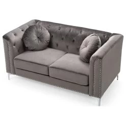 Soft velvet button tufted on the inside of the arms and backs. Pocketed coil cushion seats make this set comfortable and stylish. Nailhead trimmed and finished off with chrome plated legs, it also includes round matching throw pillows. KD design allows for EZ delivery to any home or room! Choose from sofa. Loveseat chair or reversible chaise sectional