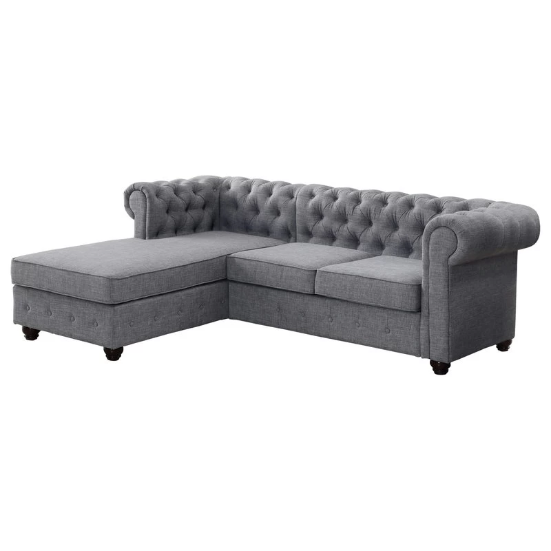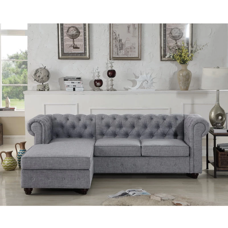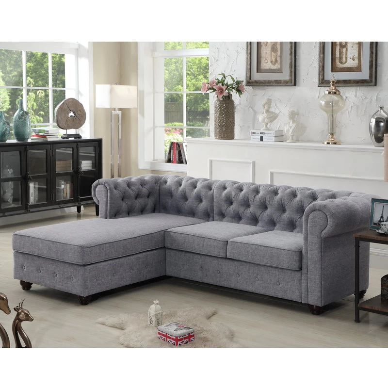 Gracia sectional sofa offers image of elegance comfort for your living room, the set will munificent adorn your living spaces. Handcrafted with a solid wood frame, this piece is filled with foam, upholstered with fine linen, and deep button tufted for textural contrast. Featuring classic chesterfield arms, Gracia�s handcrafted 4 folds on its arms add a timeless decorative touch. Dark espresso finished bun feet exclusive a signature looks for these dignified charming pieces. This sectional features a dedicated corner piece, enabling marvelous combination between the Garcia family.