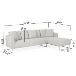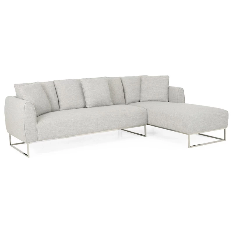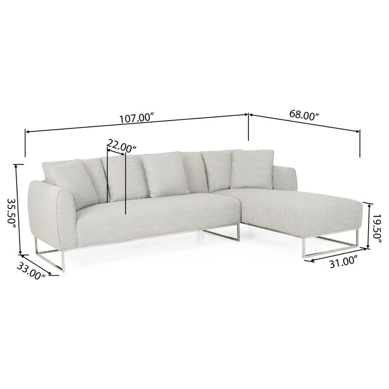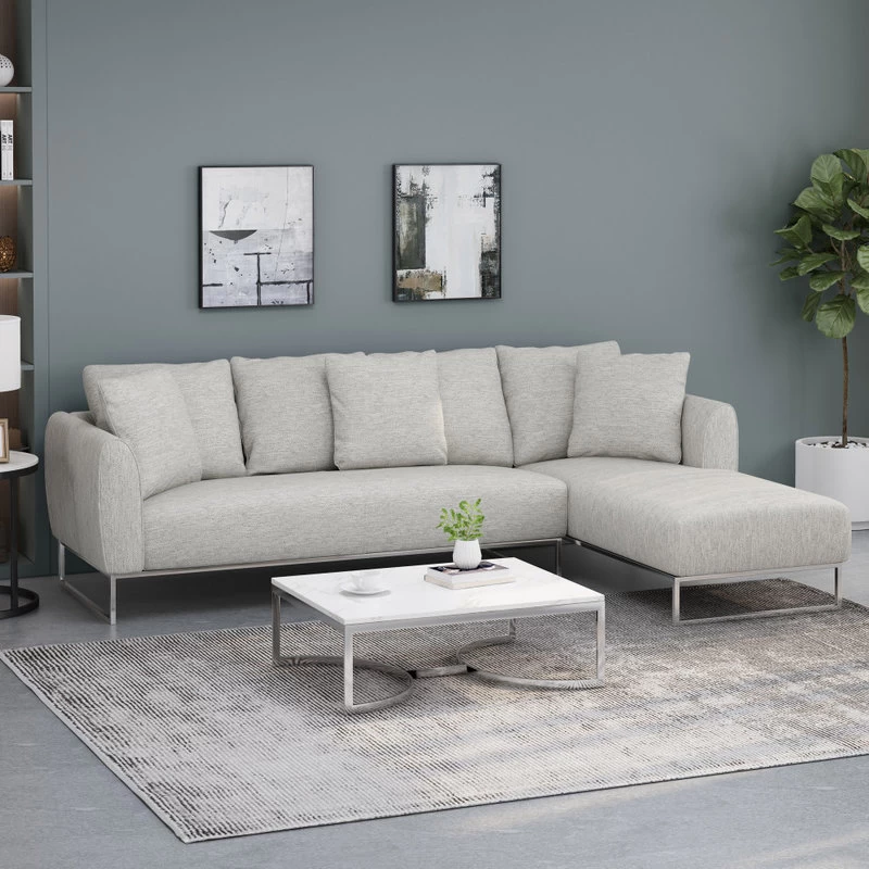 Bring home a fashionable flair to your living room space with the perfect centerpiece, giving your decor an upgrade in impeccable style. Our modern chaise sectional sofa set is the ideal addition to any living room with its sleek design, silver frame, and accent pillows. Featuring a luxurious chaise extension and stunning silver legs, this sectional acts as a streamlined statement piece that can change the whole flow of your living room while also allowing you to stretch out your legs in utmost comfort.