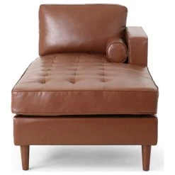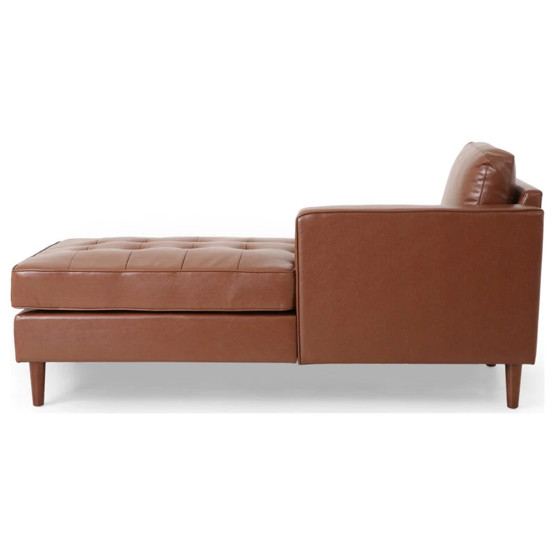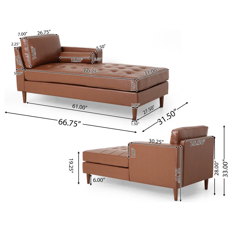 Spread out in absolute comfort and catch up with your favorite novel or TV show on your new favorite seating. Perfectly balancing smooth upholstery with tapered birch wood legs, our impressive one-armed chaise lounge offers your home a charming mid-century modern upgrade. This piece offers a beautiful button tufted design that is finished with waffle stitching in the seating, making this the perfect spot to stretch out in relaxation. Completed with a lovely rolled accent pillow, this refined chaise lounge will turn any interior space into a stunning masterpiece.