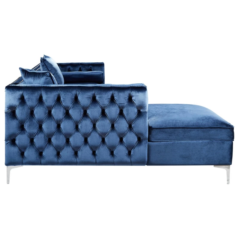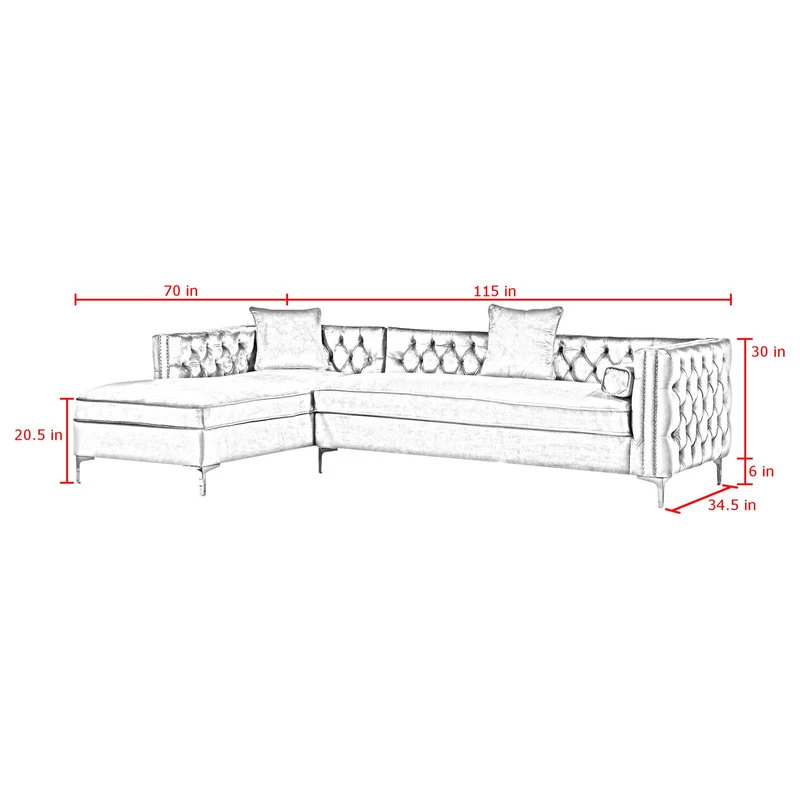 Our velvet left facing sectional sofa with chaise lounge will give your home the renaissance it deserves. Comfort and style is evident in this dynamic sofa. This sectional features rich hued button tufted velvet fabric with contrasting nailhead trim accenting clean square arms, high density foam padding, and sturdy Y-shaped coordinating metal legs. With this chaise sectional, traditional meets modern and the result is nothing short of spectacular.FEATURES: