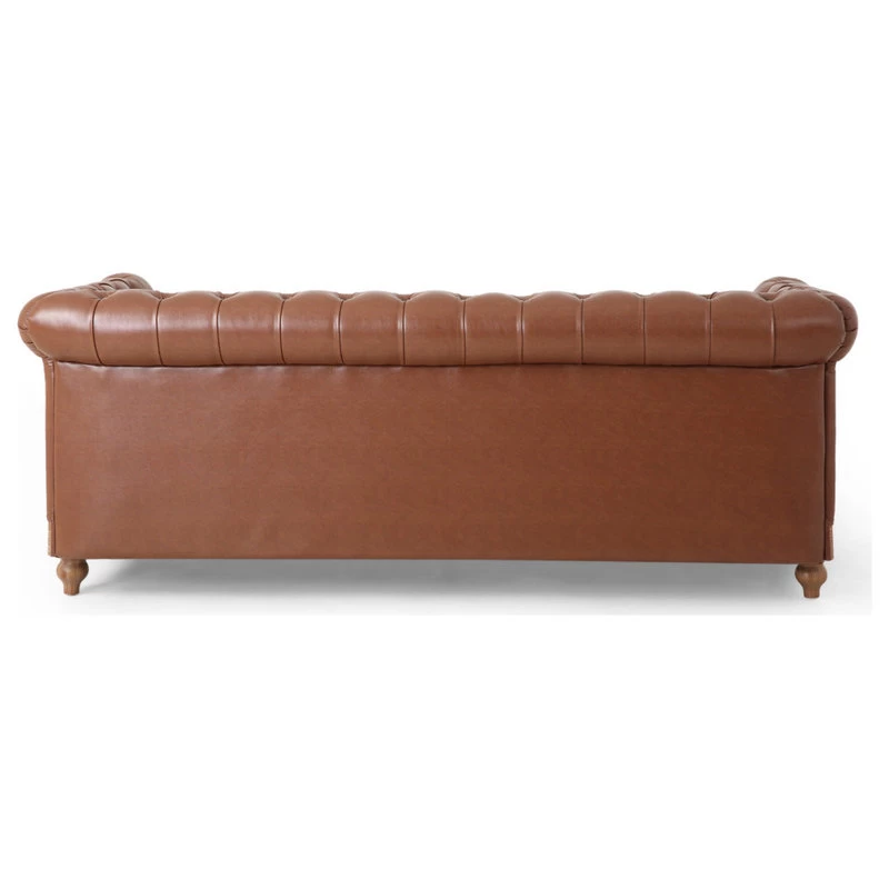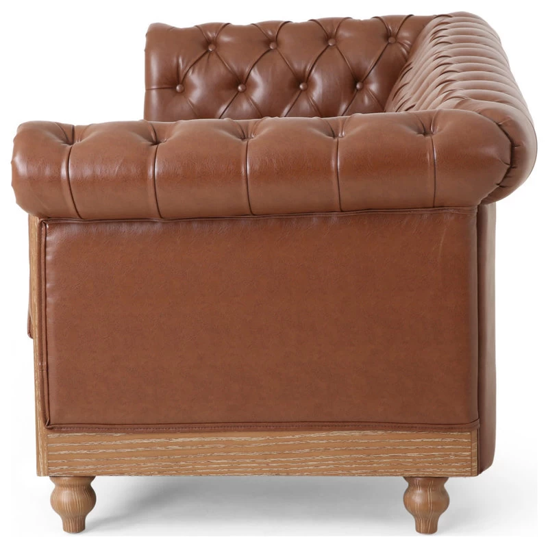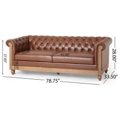 Transform your interior space with a centerpiece of timeless style. This Chesterfield inspired three-seater sofa is the ideal addition to any living room with its classic design and traditional elements such as deep button tufting, scrolled tuxedo arms, and nailhead accents. Featuring plush upholstery, this sofa stands as a streamlined statement piece that can change the whole flow of your living room, creating an open, clean space. Finished with beautifully turned legs and rustic birch wood accents, our sofa provides an elegant touch to any room.