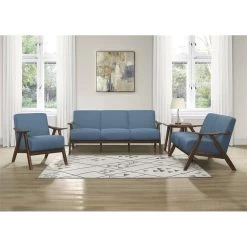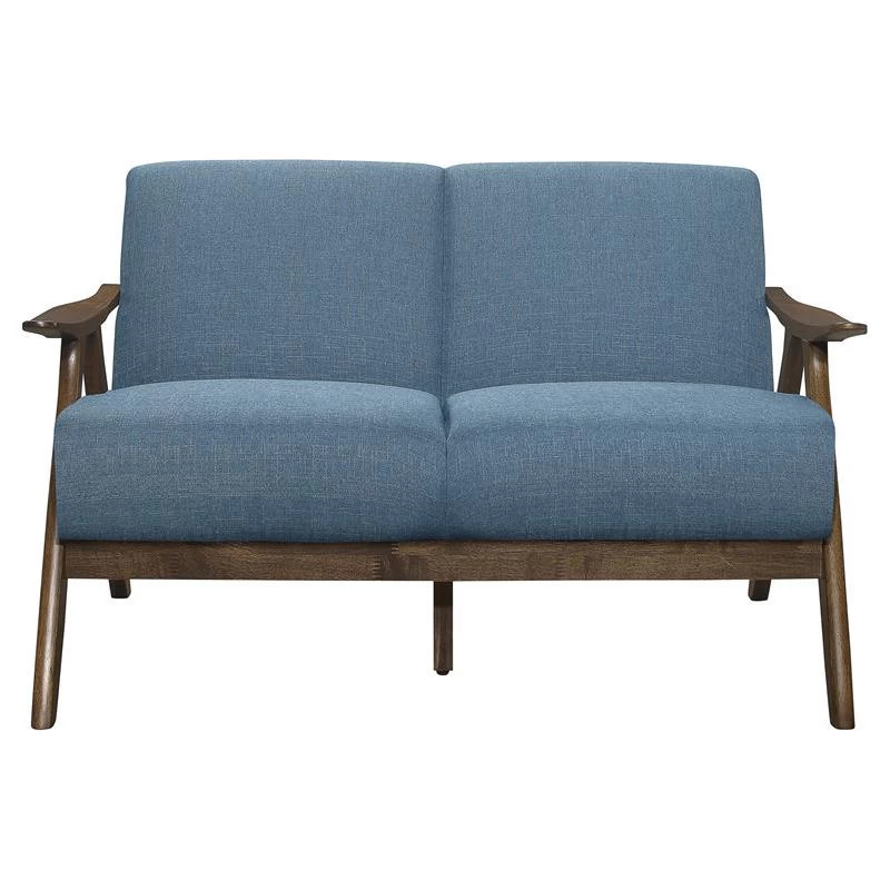 The retro-inspired wood framing of the Damala Collection will perfectly accent your modern home décor. Subtle contouring to the love seat’s wood frame is finished in walnut, presenting as a classic complement to the blue fabric that covers the padded love seat’s seat and back.