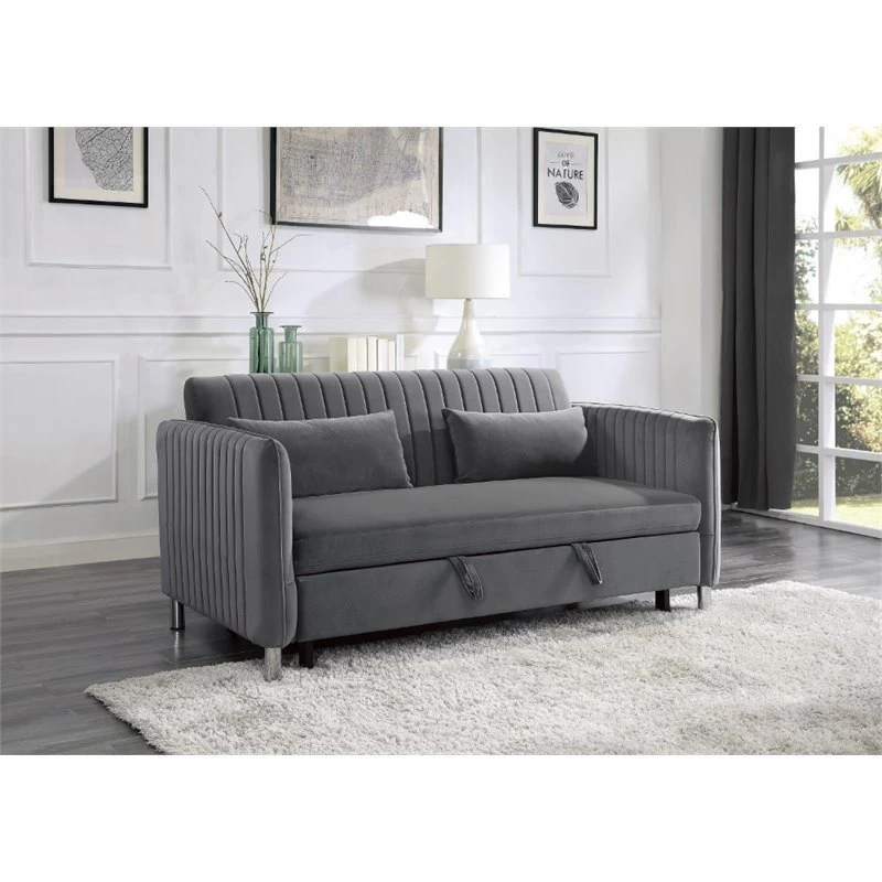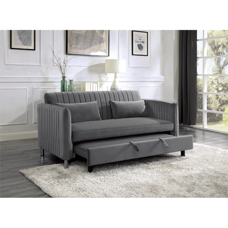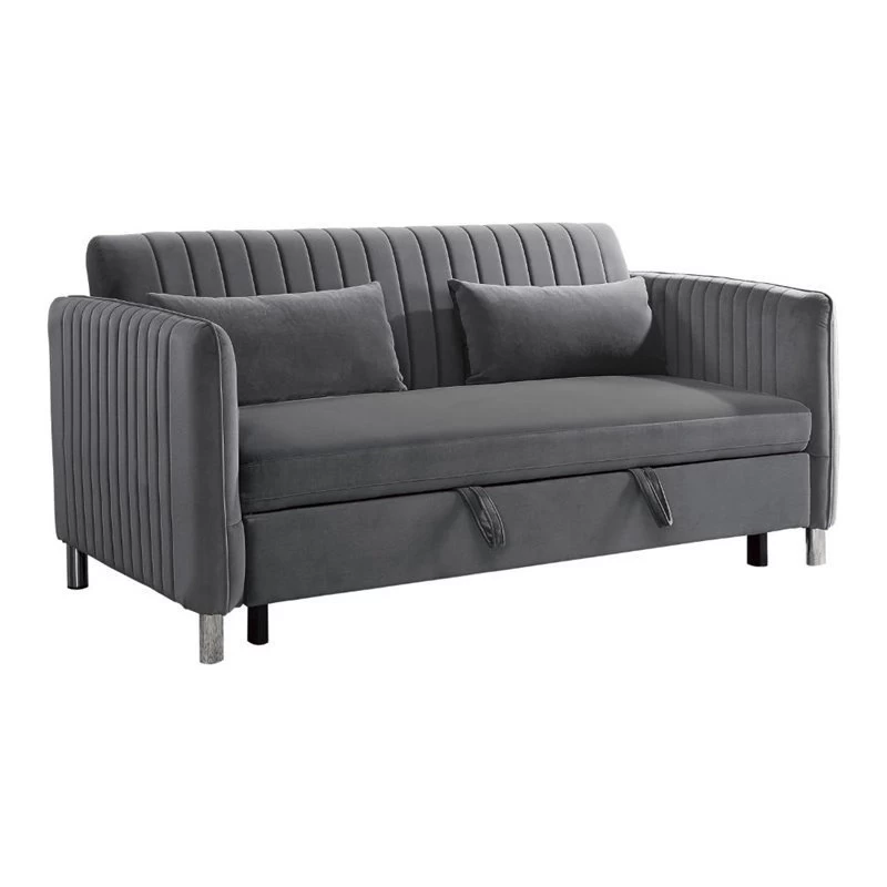 With versatility of function, the Greenway Collection presents as a unique seating option for your household. The pull-out bed and click-clack mechanism seat back of this sofa engage to create a platform for sleeping or relaxing. Offered in a brown-gray velvet cover for decorative neutrality and soft touch, the classic design furthers the placement ability within a number of home environments.