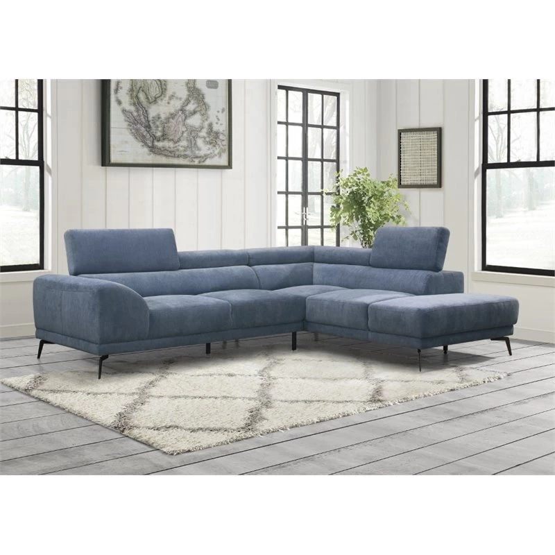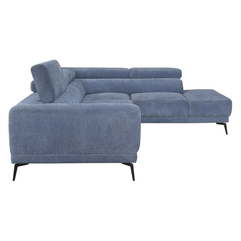 The low profile and sleek styling of the Medora Collection lend modern accent to your living room space. Headrests are adjustable to create a break in the profile of the sofa. The modified chaise provides ample space for relaxation. The blue textured fabric covering and black finished metal legs complete the look of this sectional seating group.