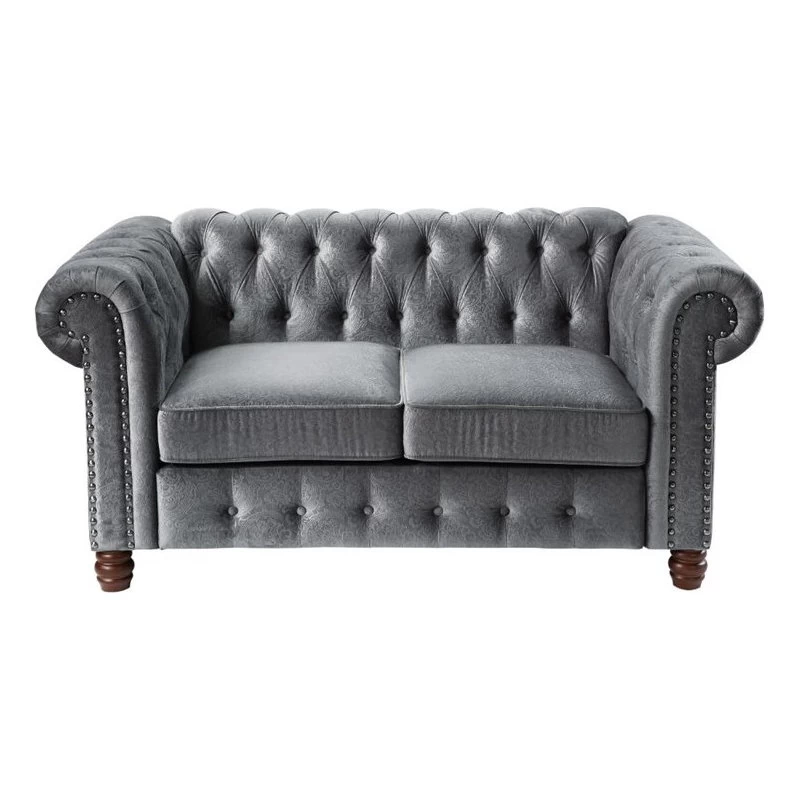 The iconic style of the Welwyn Collection exemplifies the timeless look of traditional design. This Chesterfield-style love seat is covered in dark gray velvet and features the classic accenting of button tufting, heavily rolled arms and nailhead accent. Cherry finished wood legs provide support while complementing the velvet’s neutral tone.