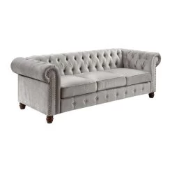 The iconic style of the Welwyn Collection exemplifies the timeless look of traditional design. This Chesterfield-style sofa is covered in gray velvet and features the classic accenting of button tufting, heavily rolled arms and nailhead accent. Cherry finished wood legs provide support while complementing the velvet’s neutral tone.