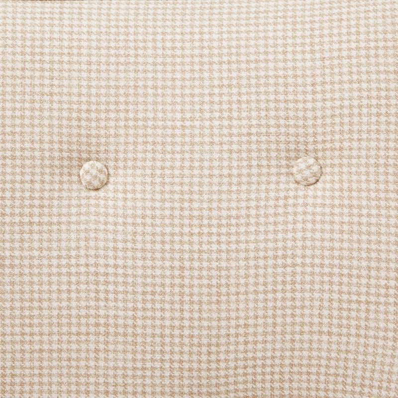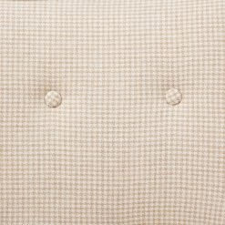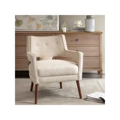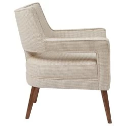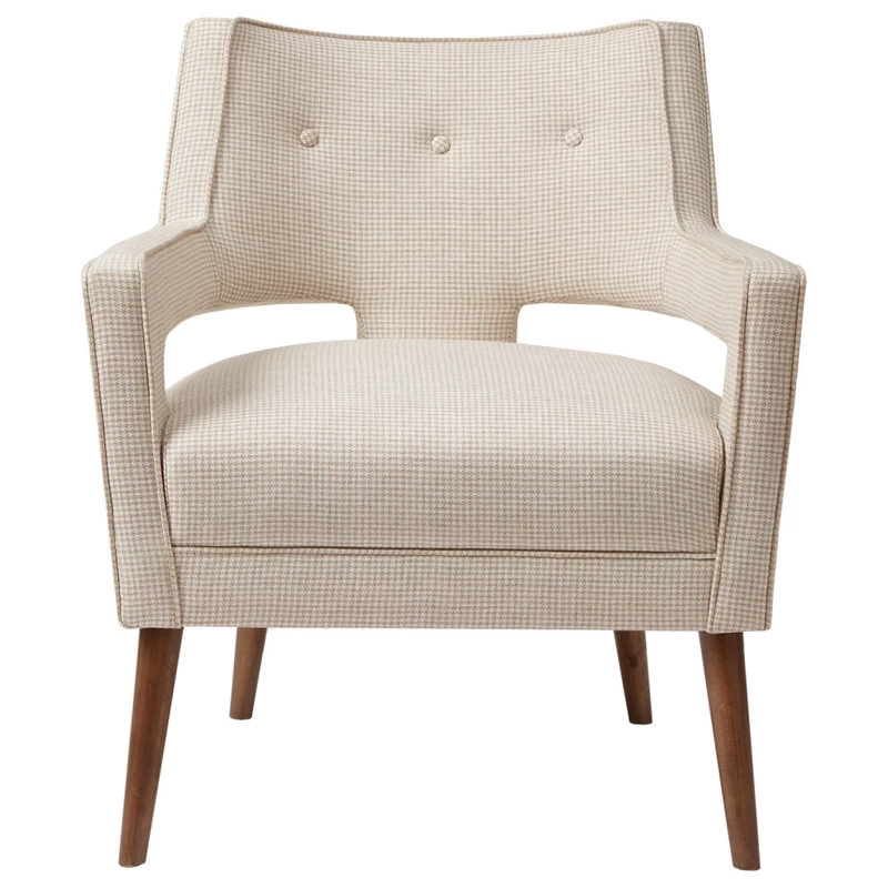 The open arm design and button tufted back creates a chic look fit for your living room. The beautiful cream upholstery features a small houndstooth pattern for extra charm and texture, while solid wood legs with a pecan finish add a rich appeal. Set this upholstered accent chair in your living room or entryway to complement your décor. Leg assembly is required.