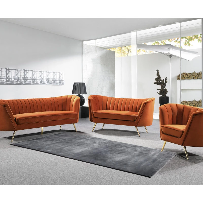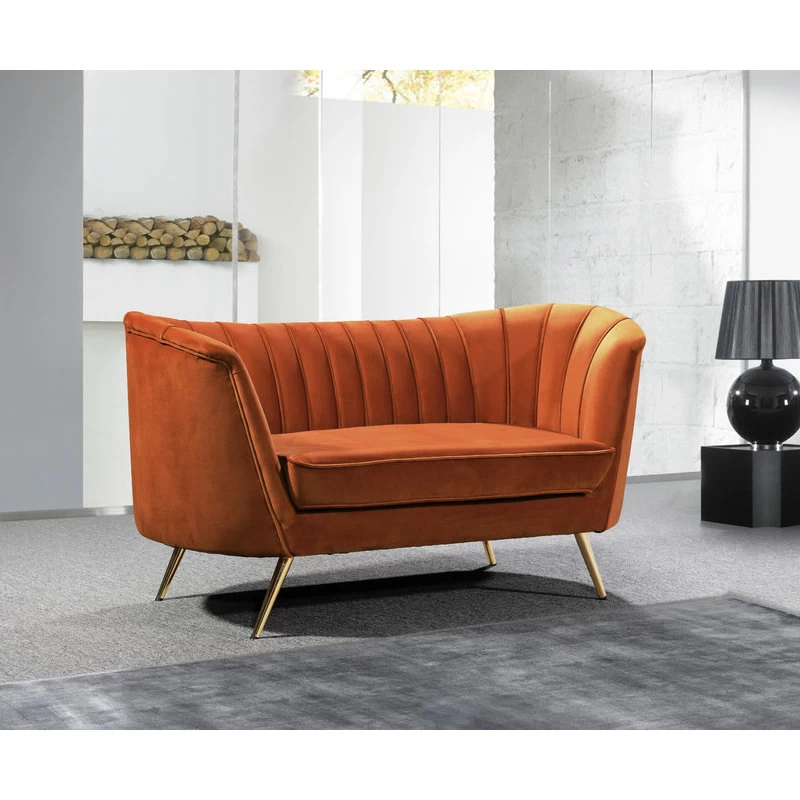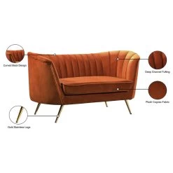 Lean back and lounge in luxurious style on this stunning Margot cognac velvet loveseat by Meridian Furniture. This contemporary loveseat features plush velvet upholstery that is both classy and sumptuous against your skin, a single seat cushion and rounded arms that curve into a low, rounded back, creating a perfect, modern piece for your home. Gold stainless steel legs support this loveseat and provide stunning contrast to the loveseat’s plush, cognac fabric.