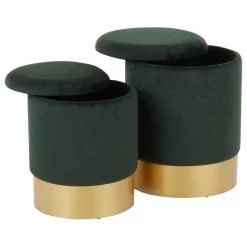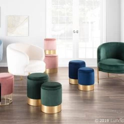 Bring a note of glamour to your home with the chic design of the Marla Nesting Ottoman by LumiSource. This set features a luxuriously soft cushioned velvet top and chic gold metal base. The smaller ottoman nests inside the larger ottoman for a space-saving design. Available in a variety of upholstery color options, choose the one that fits your space the best.
