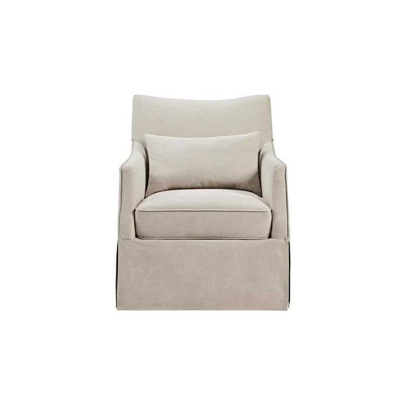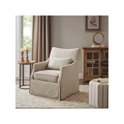Created exclusively for the Martha Stewart Bedford furniture collection that embodies country farmhouse living, the London Skirted Swivel Chair introduces a simple comfort to your living room decor. This swivel chair is upholstered in a soft beige fabric with a removable seat cushion that provides exceptional comfort. The metal swivel base allows the chair to fully rotate 360 degrees, while the skirted bottom helps conceal it for a transitional look. A lumbar pillow is also included. At her country farmhouse, Martha enjoys bringing the outdoors in. This functional and practical lifestyle is evidenced in her thoughtfully appointed decor which embraces a neutral color palette that acts as a perfect backdrop to four seasons of color. Fully assembled.