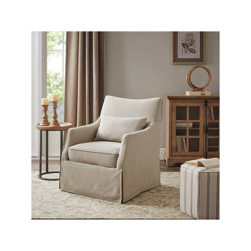 - Farmhouse skirted swivel chair in beige fabric , Seat dimension 22W x 23D x 18.5H, cushion thickness 7 inches, High back for better upper back support, Lumbar pillow included, Solid wood legs in reclaimed wheat finish, Legs assembly required, Wipe with a damp cloth or steam clean