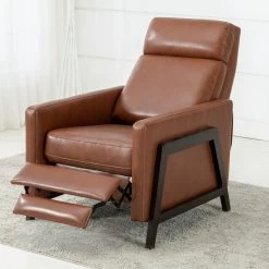 The Maxton Manual Push Back Recliner brings you mid-century modern inspired styling at a great value. This recliner features a trendy exposed wood frame with a high back and pocketed coil seating for ultimate comfort. No levers or buttons keep the silhouette sleek. The innovative leather gel upholstery provides the soft touch of a top grain leather at a great value. Perfect seating for your living room or bedroom where space may be at a minimum. Available in your choice of Midnight Blue, Black or Caramel upholstery. Your purchase includes one manual recliner.
