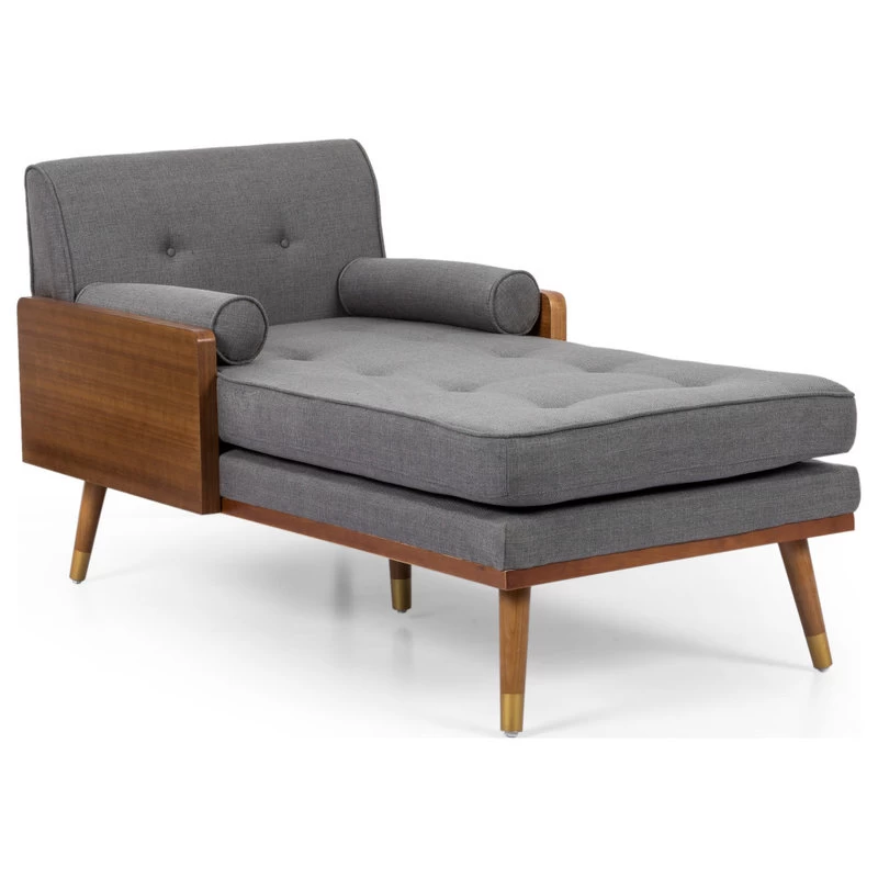 Our charming chaise lounge practically invites you to stretch out and relax in outstanding comfort with its spectacular design. Perfectly balancing wood accents with fabric upholstery, our impressive chaise lounge offers your home a charming mid-century modern upgrade. This piece offers a beautiful button tufted design that is finished with waffle stitching in the backrest and seating. Completed with iconic splayed legs with gold tips and lovely rolled accent pillows, this refined chaise lounge will make any interior space into a stunning masterpiece.