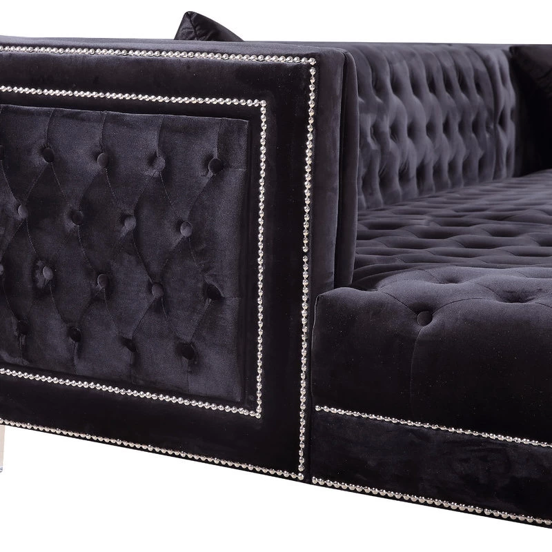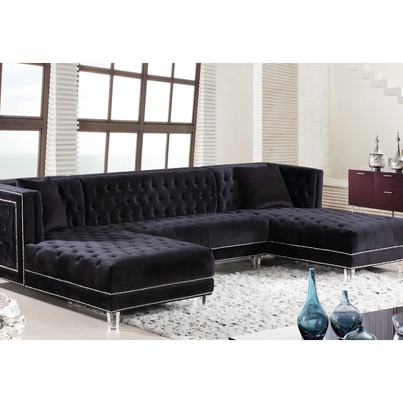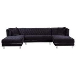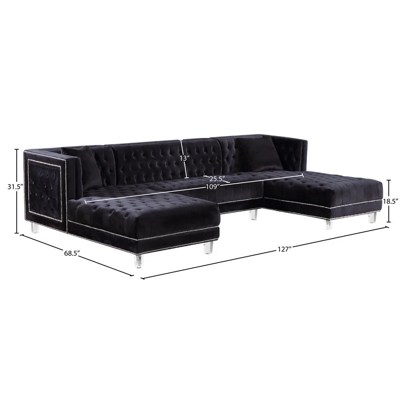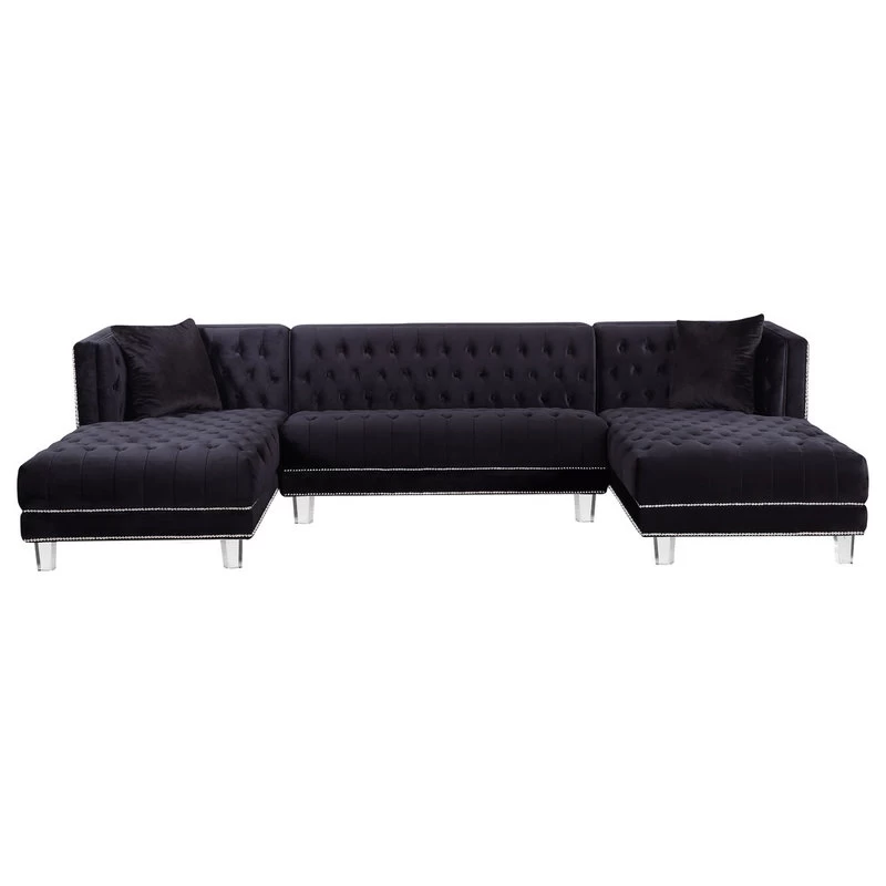 Designed with the utmost attention to detail and superior craftsmanship, the Moda 3-Piece Velvet Sectional adds an effortless twist to your modern living space. Including double chaise lounges on each end, this sectional encourages stretching out and getting comfortable for a movie night in with friends or the whole family. With its rich tufting and elegant detailing, this 3-piece sectional is the eptiome of luxury to complete any modern day home. Its base is also crafted with acrylic lucite legs and a strong frame providing stability for its users. Its pillows included that are pictured encourage contemporary comfort that compliment its sleek design.