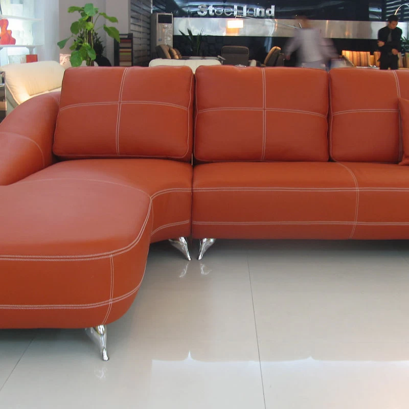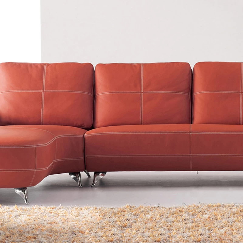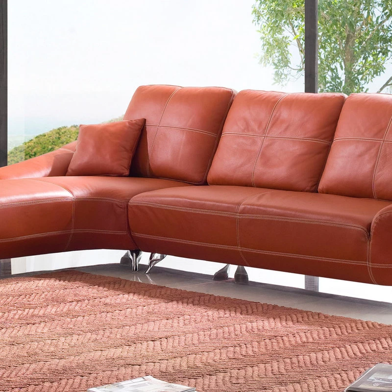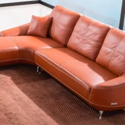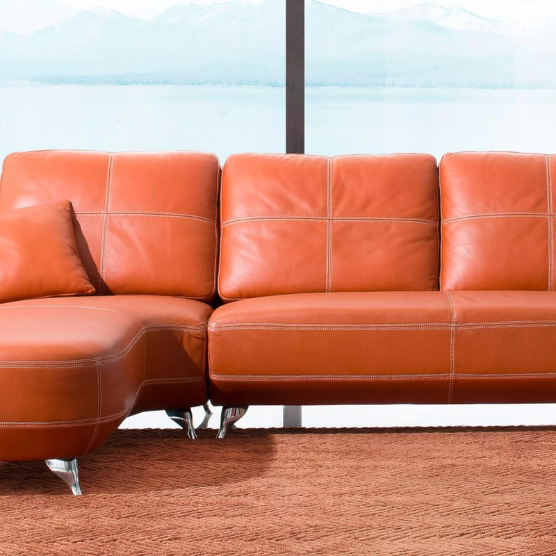 A fabulous balance of contemporary and retro styling, our Lucy sectional delivers social poise and grace in refined abundance. Soft high density foam seating combines with premium contrast off-white double top-stitching and genuine top grain Italian leather, creating an indulgent retreat. The rich, burnt orange color will warm any living room up with legendary results. Top if off with sculptural chrome legs and you have a spectacular piece that is sure to turn everyone’s heads! Includes one matching throw pillow.