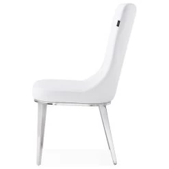The Norma chair is a classic design with a modern twist. It features a plush white leatherette upholstered seat with a curved and shapely backrest that enhances comfort and visual appeal. This is supported by angled polished stainless steel legs with a thin edge just on the bottom of the seat. If you’re looking for a modern design that isn’t as harsh or uninviting as others, our Norma Dining Chair has a softer, more feminine silhouette that strikes a perfect balance for any contemporary dining space. The suggested weight capacity is 275 lbs.